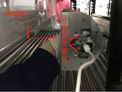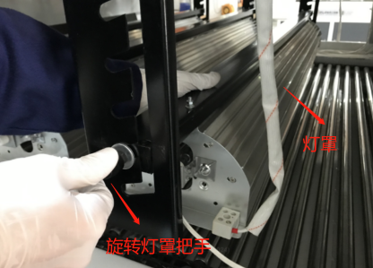 3. 轉(zhuǎn)動可調(diào)把手,將燈罩90°旋轉(zhuǎn),松開固定螺絲,取出燈管即可;